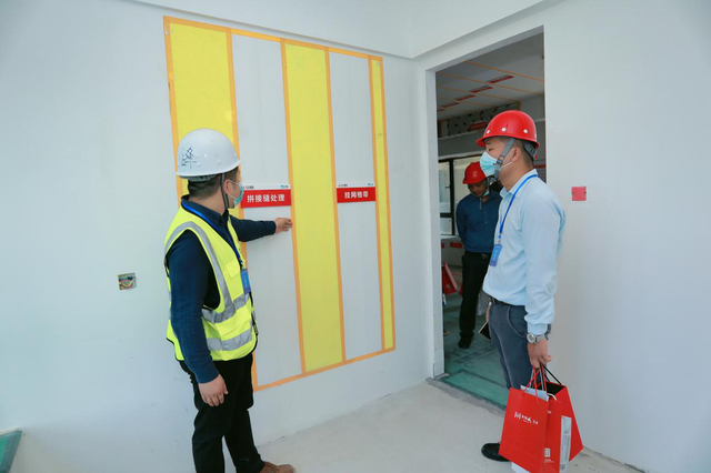 觀摩團實地參觀了樣板引路區、3層實體質量樣板區、地下綜合管線及地坪墻身樣板區和安全體驗區4個展示區,通過專人講解和答疑、展板介紹、實地體驗等多種方式集中了解了項目裝配式特色和質量成果。